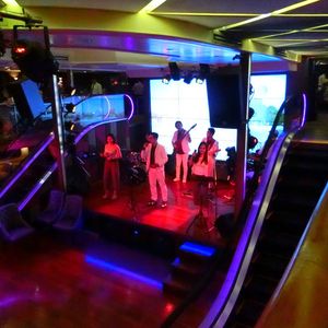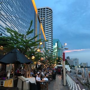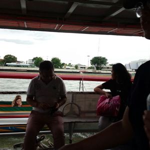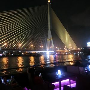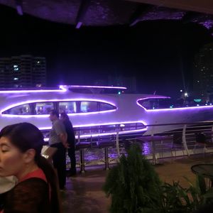 船では1階の船内でバンド演奏、3階のオープンデッキでもライブをしていました。食事はブッフェ形式でそれぞれの階にあり、食べやすい味で、辛い料理もなかったです。タイ料理を期待している方にはちょっとがっかりかも。出航間もなくは人が殺到してますが、どんどん補充され、最後まで料理が無くなることはありませんでした。飲み物は有料でテーブル毎にあとで清算。リバーシティから出航して北は暁の寺ぐらいまで南はちょっとわかりませんでしたが時間内に2往復はするため、1度見逃がしても大丈夫です。クルーズの後半はまた雨が降ってきましたが、十分楽しめました。帰りはホテルまで送ってくれますので雨でも全然平気で、タクシー待ちや雨で混雑してる中、迎えに来てもらった車にさっさと乗りこみスムーズに帰ることが出来ました。午後から夜まで十分バンコクを堪能できました。