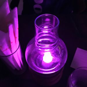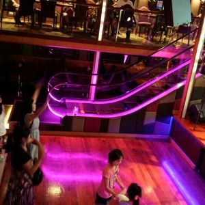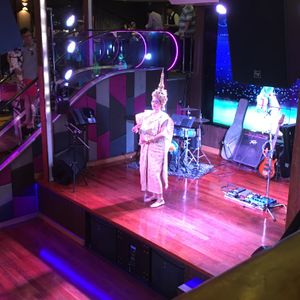 そして遠くからカントリー調の音楽とともに、私達が搭乗するお船が夕焼けの空と同じ色の紫色の光を灯しながら船着場に到着。今度は生演奏と、生歌声で乗客を迎え入れるという洒落た演出(^o^)なんとその時間だけアメリカンでしたー。あたりも暗くなり、クルーズ船の紫色の光が幻想的で乗客め紫色になる。素敵です。案内されたテーブルは最上階の先端。ワットアルンのライトアップも遮るものもなく、見れる場所で撮影もゆっくり撮れます。船の進む速度も速くもなく遅くもなく、料理も飛ばされてしまうこともないので安心してくださいね。ただ飲み終えた缶が飛びそうで置き場に困りました〜(^^;料理は、もちろんタイ料理がほとんどですが、中になんちゃって巻き寿司などありましたよ。食べてはいませんが皆さん食べてましたね。私はあさり?ハマグリ?貝とイカばかり食べてましたー。パクチーが苦手なのでパクチーの縁遠い物を探して食べてました。デザートもありますが、昭和初期のデザートですね。これも文化と思い食べましたがやはり甘い!甘すぎるのが難点ですね。