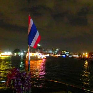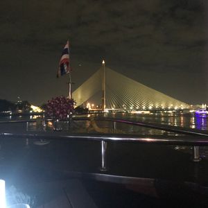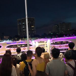 で、しっかり休憩していざチャオプラヤー川のディナークルーズに。川沿いでそろそろ薄暗くなるライトアップして異国情緒あふれる写真撮影ができて、インスタ映えする箇所もたくさんあります。川の中も魚が異常にいてこれもインスタ映え?少し奇妙な光景です。なんの魚?と。もしかしてナマズ?と。これも薄暗くて銀色のお腹部分だけ光を放ち、キラキラしてましたー。^_^;