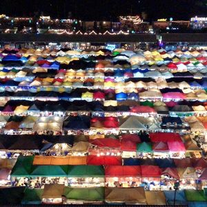 バンコクインスタ映えスポットを集めた便利な午後ツアー。ツアーのほとんどはチャチュンサオ県(ピンクのガネーシャ)への往復。最後の鉄道夜市では駐車場に上がり高い位置からでないとテントのカラフルな写真撮影ができないため、隣接するモールの駐車場が解散場所になっています。