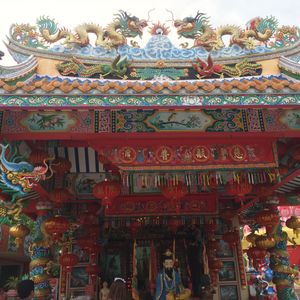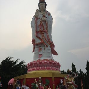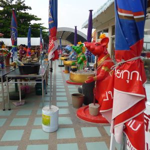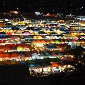 週末限定のツアーということで・・・これに参加したく旅行日程を変更しました。午後1時30分集合ということで地図の場所に行きツアーデスクに聞きましたが、いまいち誘導がわからず少しご立腹しながら出発を待っていました。まず、ワット・パクナム寺院へ向かいました。寺院の中に入りエレベーターで5階へ・・・降りるとそこで目に付いたのが天井でした。早速参詣し、写真を撮りました。ゆっくり見ていましたが、我々には、この5階がメインのように感じました。その後、ワット・サマーンラッタナーラーム (ガネーシャ)まで移動。約2時間ほど車に揺られ到着。ここでもしっかり参詣し日本語ガイドの説明に聞き耳をたてましたがよく聞き取れず残念。時間も時間なのでなにか軽食をと思いウロウロ、しかし時間が遅くすでに業務終了していました残念。ここからまた移動で2時間ほど車両に揺られて到着したのが、ナイトマーケット市場の隣接駐車場でした。上階に上って下を見ると、あら綺麗。いい感じの市場を上から見学し、写真を撮って、いざ市場へ・・・