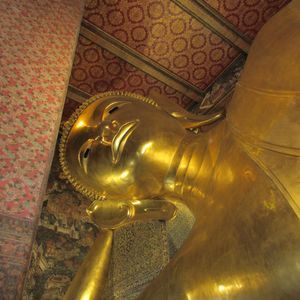 最後に、ワットポーです。ここは、タイマッサージなどでよく聞く寺院なので、期待して行きました。やはり、メインは金色の寝釈迦像で大きく、綺麗でした。寝釈迦像はアユタヤでも見たのですが、屋外の白い巨像に金色の布が掛かっているくらいでしたので、比較するとなんとも豪華に感じます。108の煩悩のつむじまで、金色に輝いていました。やっぱり、バンコクの寺院はお金持ちですね。後、感動したのは、足の裏にある108の螺鈿細工です。仏教の世界観らしいのですが、「ま、よくわからないが綺麗だね」が感想です。その後、本堂にて金色の座釈迦像をみて、「ここまでくるとほほうとしか言いようがない(笑)」どこに行っても仏像だらけで、なんというか、もう「仏像でお腹いっぱい」という感じでした。帰りは、出口を出て、ワゴン車を待っていたのですが、丁度タクシーも列をなしているところでしたので、耳を澄ましていると、白人夫婦にスクンビットまでタクシーで1500THBと運転手が言ってました(笑)。ぼりすぎでしょう。