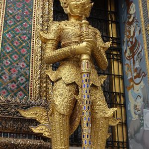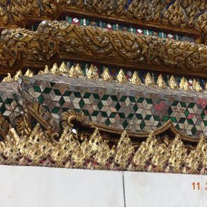 クション気分です。タクシーやトゥクトゥクでも行くことができるようですが、渡し舟が一番安いみたいです。エントランスを入りますと山門があり、二人の巨大なヤックさんが門番を務めています。この山門の奥に本堂がみえます。本堂は陶器のタイルをちりばめたような作りですが、全体にいろいろな模様が模してあり、近くによるとなにか懐かしいような感じがします。ワットプラケオとは全く違った庶民の為の寺院といった感じです。なんとなく親近感を覚えます。余談ですが、ここでなんとなくタイパンツ(どこでも100THB)を買ってしまいました。