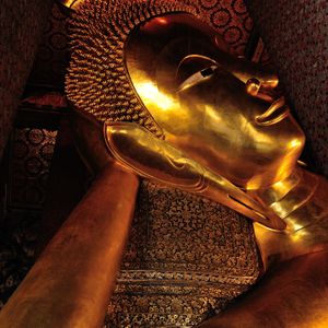次にバンコク最古の仏教寺院と伝わるアユタヤ時代の創建「ワット・ポー」へ。黄金色に輝いた大寝釈迦仏の大きさに驚かされます。頭からつま先まで体長46Mの超然とした寝姿は、釈迦の悟りの境地と慈愛でしょうか。