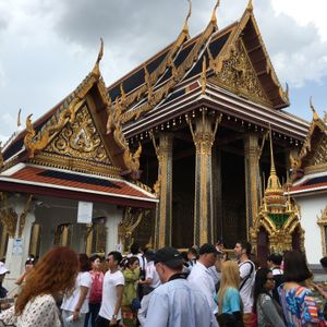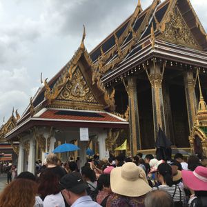 *エメラルド寺院 各国観光客で大混雑です。中国の方の日傘と自撮棒に注意です。入場時の服装チェックが厳しく、欧米女性が胸元が開いた服を注意されていました。昔とは混雑状況が変わっていて、個人で来ていたら辛かったと思います。