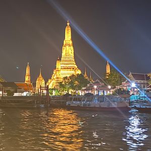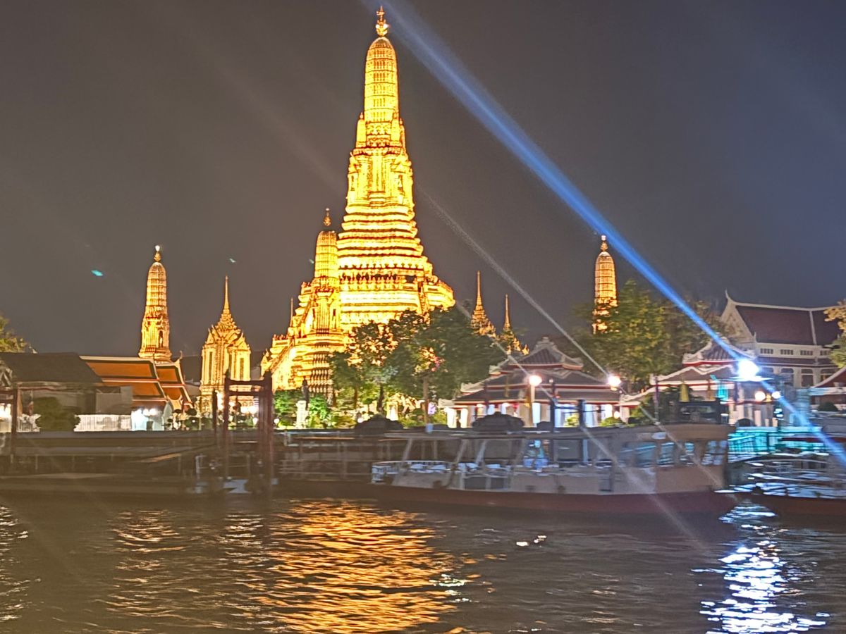 出航して15分ほどでライトアップされたワット・アルンが見えてきます。最初はビュッフェがかなり混み合うので、まずは景色を楽しんでから料理を取りに行くのがおすすめです。
