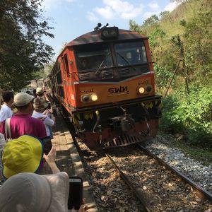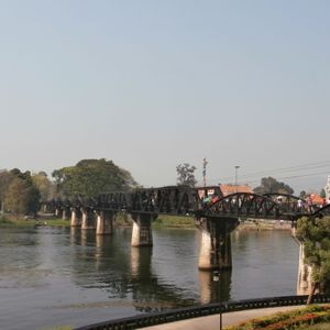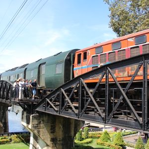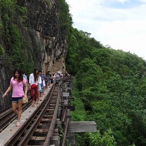 バンコクからバスに乗って約二時間、途中休憩をしますのでドリンクやスナックを買うことができます。バスは船着き場につき、小型ボートで有名な鉄橋まで約15分のショートトリップです。ボートは結構スピードがあり迫力満点ですが、救命胴衣を着ますので安心です。橋のたもとの到着後は戦争博物館や慰霊塔を見学後、鉄道に九十分ほど乗車します。車内ではドリンクや土産物を売りに来ます。かりんとうのような菓子が美味だった、列車を降りたらレストランでインターナショナルビュッフエの昼食、パッタイなどのタイ料理もありおいしかった、食事後バスに乗車しバンコクに戻りますが、渋滞もあまりなくバンコクには夕方五時過ぎにつきました。充実した一日ツアーでした。