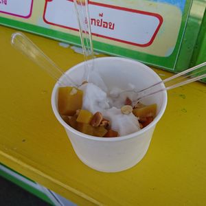 鉄橋を歩けますが列車が来たら端によけて待ちます。ギリギリのところを列車が通過、乗客とハイタッチしてました。(私はしませんでしたが楽しそうで微笑ましかったです^^)鉄橋は周囲に屋台や土産物屋が集まっています。ココナッツアイスにトッピングのナッツを乗せて買いました。店員さんはトッピングを試食させてくれたり写真にも快く応じてくれるサービス精神旺盛で楽しく美味しかったです♪特大のタピオカ入りミルクティを買ってバスに戻りましたが、ガイドさんが「甘いよ!飲めるの~?」と絡んでくれて楽しかったです。笑