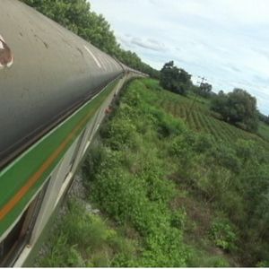 線路に沿って、バナナの木やヤシの木が見られ、東南アジアの風景が広がります。