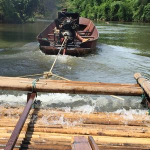 いかだ下りは最初、エンジン付きのボートで上流まで引っ張ってのぼり、下るときにいかだを操る少年が器用に船着き場まで漕いでくれます。