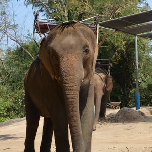 そして到着!像が目の前にあまりの大きさに言葉を失いました!象の上に乗るとすごく揺れて怖かったですが、シートベルトがあったため安心しました。ジャングルの中を象に乗り入ったため、インディージョーンズ的な気分にw沼の中に像が入った時はとてもスリルがあり、興奮しました象使いが合図を出して止まったかと思うと、いきなり降りてビックリしましたが、私たちを前の象の頭の上に乗せてくれました!象の毛がすごいチクチクと刺さることに驚きました!カメラを渡すとたくさん写真をとってくれ、象に鼻をあげるように指示を出してくれたりとサービスがよかったです!象さんも象使いの指示に従っていて、とても頭がいいと思いました!象乗りが終わると、20Bで餌(きゅうり二本)を買うと、直接あげることが出来ました。鼻水が少しかかりましたが、興奮して楽しかったですw