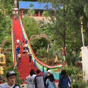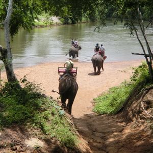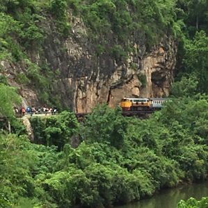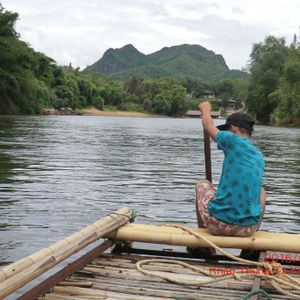 当初、ピマーイを考慮していたのですが、往復8時間がきついと感じ、その振り替えに「カンチャナブリツアー」を申し込みました。そんな訳で、大した情報もなく見学に臨んだのですが、実際参加したら、何もかもが面白いのです。それぞれの感想を書いてみます。 ★「洞窟寺」の階段はちょっとキツイ。お参りの後、洞窟をくぐり抜けると幸せになれそうなので、勿論、洞窟に入ってみました♪(幸せになれるかな) …紹介画像にある尼僧の水中浮遊は見られなかったけど、雄大な景色が眼前に広がって気持よかったです。 ★「戦場にかける橋」では、列車が動くのが見られて嬉しかった♪…鉄橋渡りも、映画を見ているので、楽しみながら橋を往復しました。 ★「象乗り・いかだ下り」…何度も象には乗っていますが、ここは、急階段を上ったり下りたり。水中の中へ入ったり。普通の象乗り体験とは違う体験ができました。 ここでは、多くの青少年が頑張って働いています。 頑張れの応援心から、チップは勿論、記念写真も納得での、お付き合い。…そして、いかだ下り…ゆったり静かに川を下ります。 ★「泰麺鉄道乗車」…これは絶対楽しいです。なんか、アドベンチャーワールドの世界観って気がします。 以上、きっかけは、取りあえず参加したツアーでしたが、大きな間違いでした。絶対参加すべき、面白ツアーだと思います。 ガイドさん・ドライバーさん。楽しい一日を本当に有難うございました。