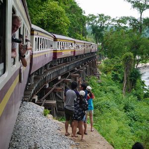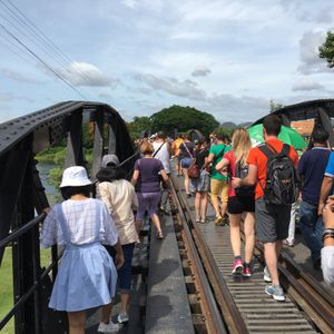 最初のバスに集合の時点から少し遅れている人がいたり参加者の中に体調不良の方がおられ予定より早いトイレ休憩、その人がバンコックへ引き返す乗り合いバスを当たったりでやや押し気味ではあったものの渋滞もなく船着き場に着き鉄橋を下から眺め上陸し、鉄橋見学・散策15分、戦争博物館見学30分、戦没者慰霊塔5分の時間をかけ、次はいざ列車に乗るというときにガイドさん曰く「今日は列車が遅れていないから早くいかないと乗り遅れる」と慰霊塔から小走りに、、78才の膝の悪い高齢者がいたので本人も急いでましたが気の毒でした。どこかの見学時間をあらかじめ調整はできたはずで段取りの悪さは否めず。ガイドさんは他のガイドと会った時や列車内でも車掌とほとんどおしゃべり、昼食時にも最初説明だけで様子見にも見ませんでした。致命的ではないがちょっとプロ意識と配慮には欠けてました。ツアー内容には問題がないだけに残念です。