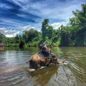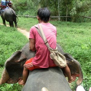 ゾウに乗って、森の中・川の中を歩いた上に、普通 ゾウ使いの人しか乗れない頭の上に直接乗せて貰い、親子ともども大興奮、大満足のツアーでした。当日は雨期で道中は雨が降ったり止んだりしてましたが、ゾウに乗るタイミングでは丁度雨も止み用意して頂いた雨合羽を使わずに済みました。ゾウ使いの人にカメラを預けると、写真も沢山とってくれました。ゾウの頭は思ったより柔らかいけど、毛は結構ちくちくしてましたよ。カオヤイ国立公園では、野生のゾウが道路を歩いているのに遭遇したり、一瞬でしたが森の中にいる熊も見ることができました。ガイドさん曰く、熊はなかなか見ることが出来ないのでとてもラッキーだった様です。カオヤイ国立公園へ行くまでの道中では、牛車に乗ったり、昼食では、自分で簡単な料理を作って食べたりしながら、長い道中を退屈しないように工夫されていました。帰りは、バンコク市内の渋滞を考えて