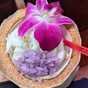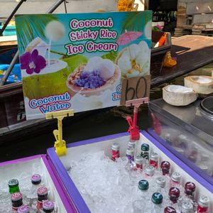 ちなみに、スピードボートを降りてから、手漕ぎボートに乗るか迷っている皆さん、ぜひ乗ってください。これはこれでゆったり乗れてまた違う雰囲気を味わえます。手漕ぎボートは止まって欲しいお店があればボートを漕いでくれる方に身振り手振りで伝えれば止まってくれます。ちなみにスピードボート区間ではなく、手漕ぎボートに乗ってからの区間で買うココナッツアイスが美味しく安いそうです。値段は60バーツでした!!!ぜひ手漕ぎボート乗る方はそちらで買ってください。肝心のお味ですが、アイスと餅米というパッと見は不思議な組合せですが、これがなんともいい味のバランスでおすすめします!お花ものってるので写真撮っても映えます(笑)我が家は美味しく食べたあとに残ったお花は子供の頭に乗せて写真を撮って2度楽しみました!(笑)