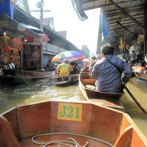 狭い川筋をエンジン付きの船と手漕ぎ船がぶつかりあって進む水上マーケットは是非とも乗船しての体験をオススメします。