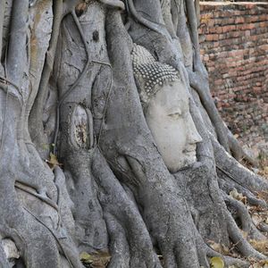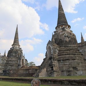 まずワット・マハタートへ。この遺跡はミャンマー軍による破壊の跡が鮮烈に残されており、とくに木の根に絡みとられた仏頭の姿がことのほか有名です。次いでアユタヤ王朝の3人の王様の遺骨が納められているというワット・プラシーサンペットへ。均整の取れた三つの仏塔が並列している様子が見事でした。