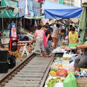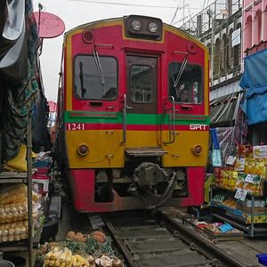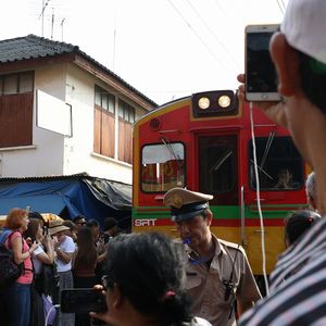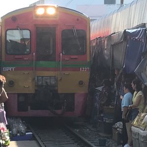 メークロン市場の電車は、轢かれるかと思うぐらい近かったです。電車が来る時間になると、観光客でいっぱいでした。