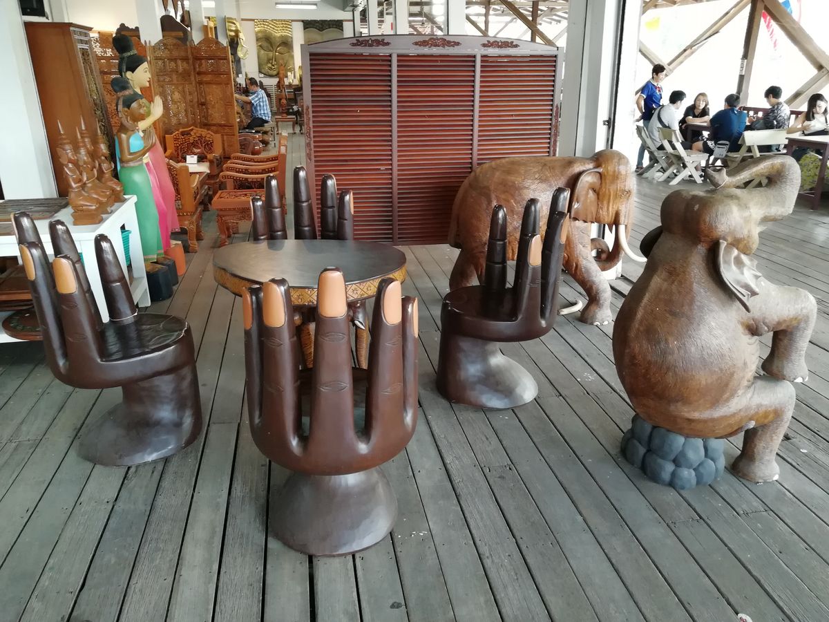 個人的なオススメは、ココナッツアイス(ボートの上にアイスのタンクが載っています)のボート。見た目も味も素晴らしいです。そして揚げバナナ(ボートの上で油で揚げています)のボート。絶妙な甘さと油分が病みつきになりました。マーケットの入口から見える運河に停泊していることが多いと思います。早く買わないと行ってしまうかもしれないので、急いだ方が良いでしょう。なお、陸上では民芸品や木彫りのオブジェ(職人とみられる方が制作中のものもありました)、食器、絵画なども売られています。物によってはかなり高額です。