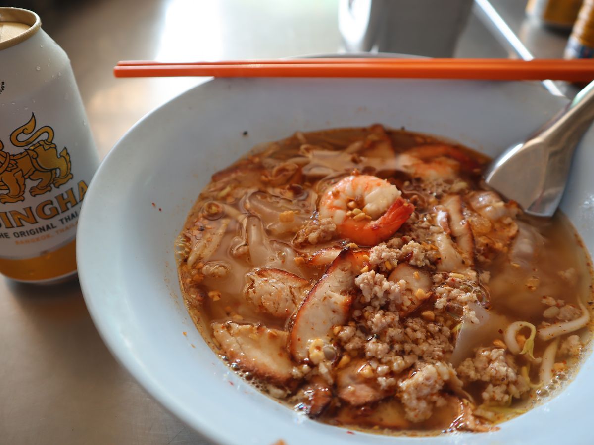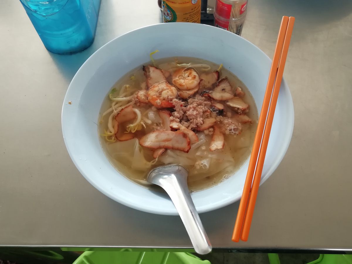 ・ローカルなレストランでタイ式ラーメンとカップアイスを食べる