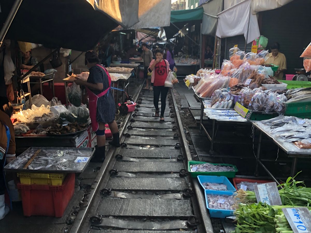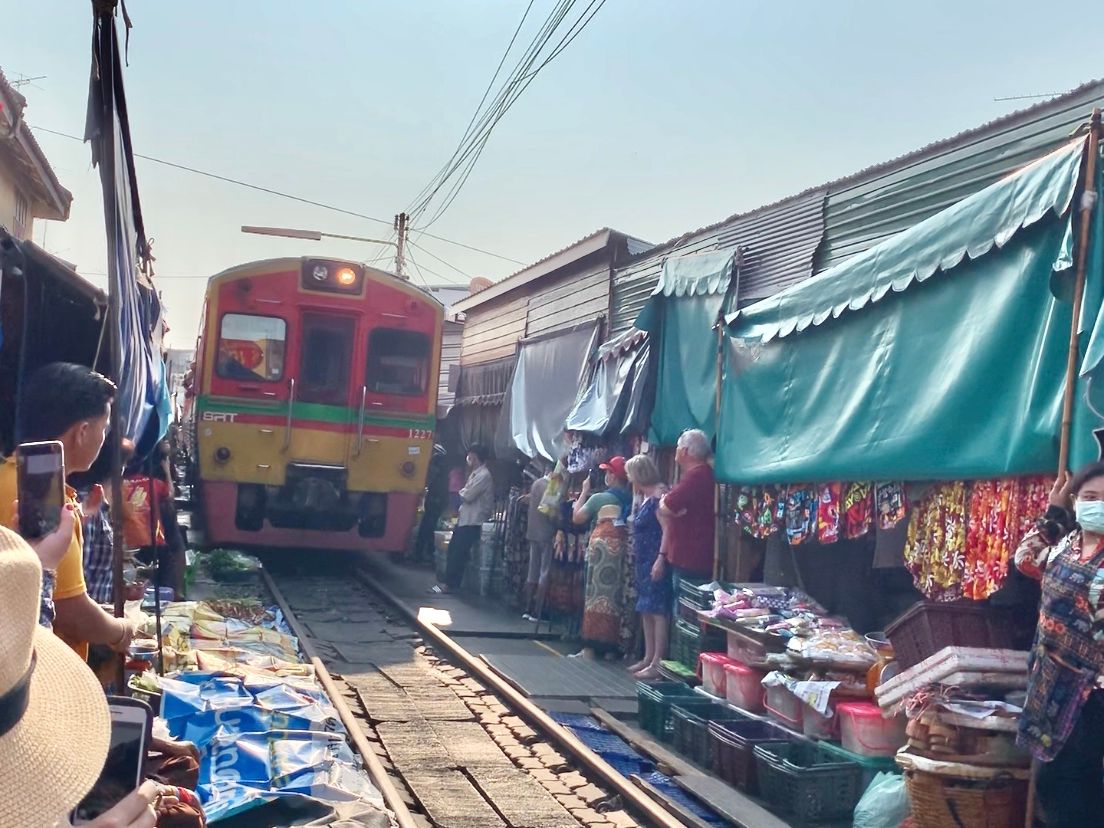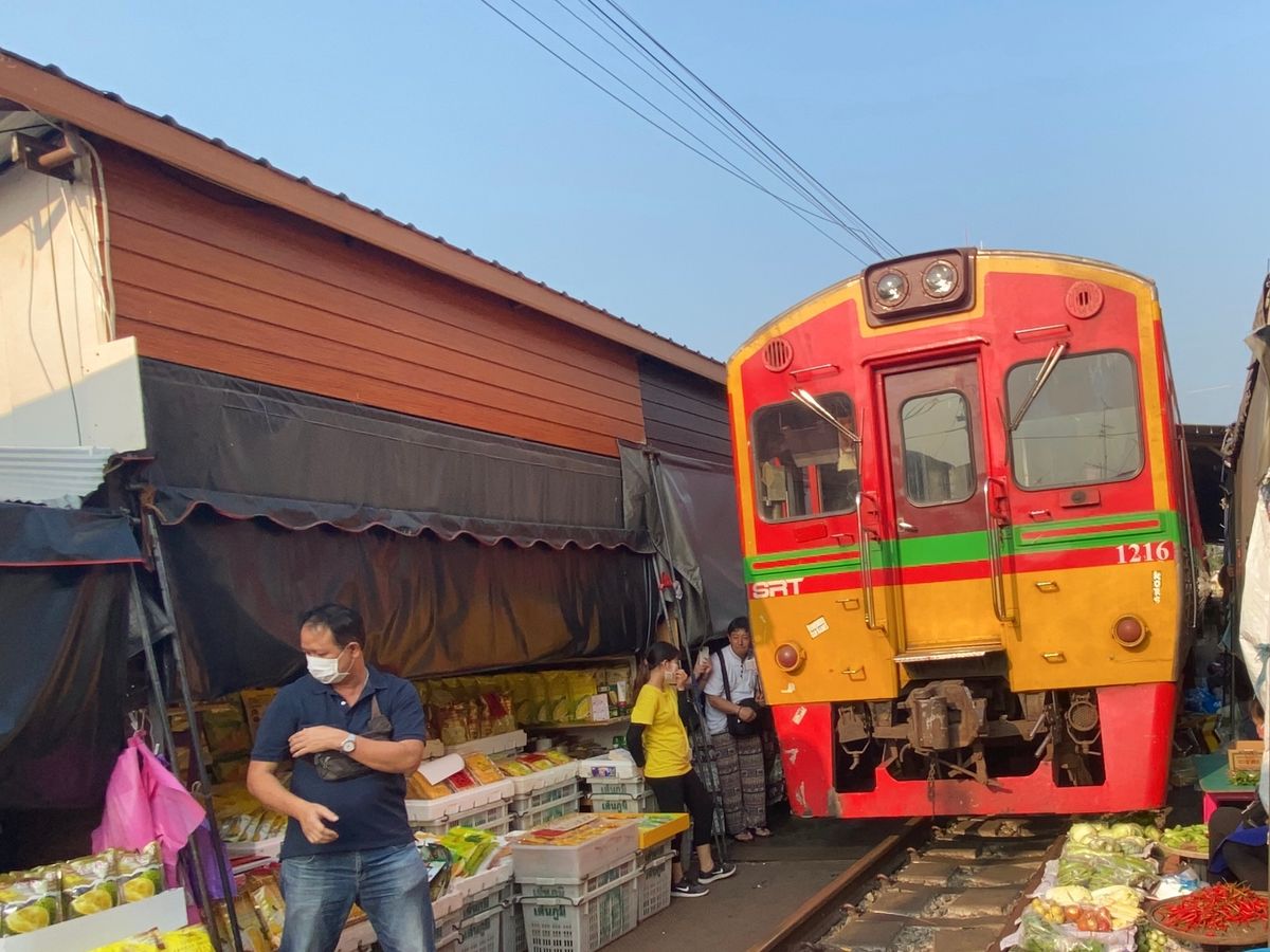 メークロン市場には列車が市場を通るちょうど20分ほど前に到着しましたので、その間に線路や枕木の上を歩きながら市場の散策です。「この時点で既に日本ではありえないね」と談笑しながら列車の到着を待ち、言葉通り目の前スレスレのところを走って入ってくる列車におおはしゃぎでした 笑 車窓からも搭乗している方々がカメラを回しているのがよくみえ、観光客は皆笑顔。貴重な体験ができて楽しい思い出になりました。