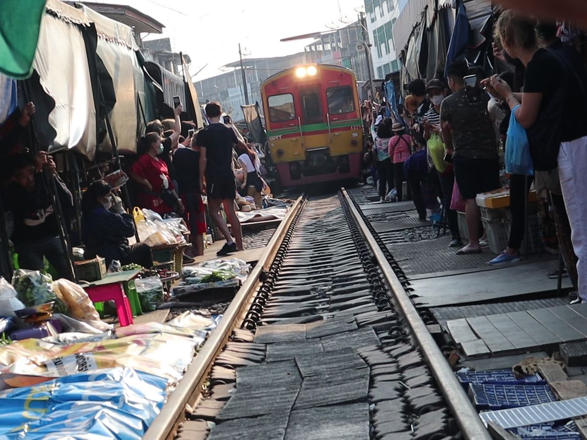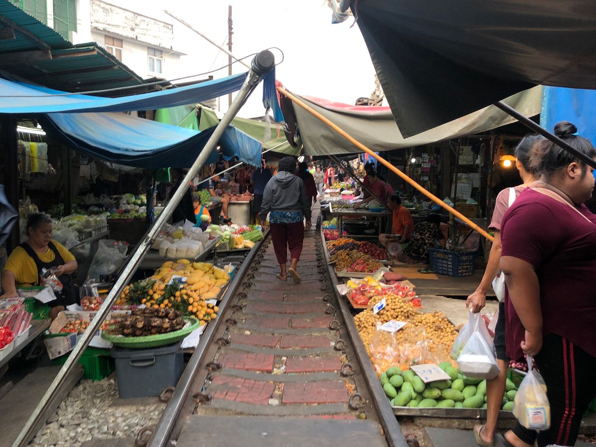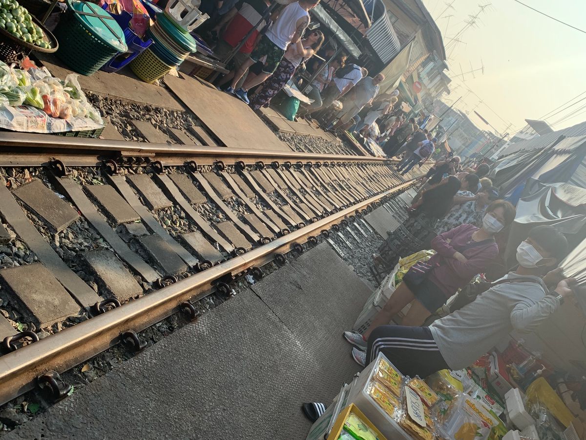 メークロン市場には列車が市場を通るちょうど20分ほど前に到着しましたので、その間に線路や枕木の上を歩きながら市場の散策です。「この時点で既に日本ではありえないね」と談笑しながら列車の到着を待ち、言葉通り目の前スレスレのところを走って入ってくる列車におおはしゃぎでした 笑 車窓からも搭乗している方々がカメラを回しているのがよくみえ、観光客は皆笑顔。貴重な体験ができて楽しい思い出になりました。