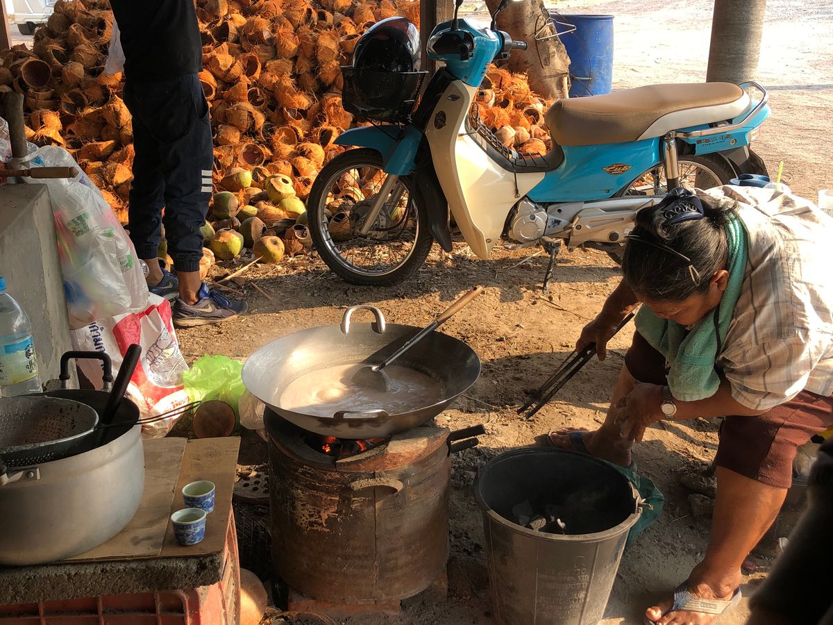ココナッツファームを見学しました。ここでは機械化されておらず、手作業(と言っても道具は使います)で椰子砂糖を作る工程を見学できました。ココヤシ(ココナッツ)の蜜を加熱して濃縮、特殊な道具でかき回しさらに濃縮され、砂糖の塊ができます。これをさらに乾燥させると、椰子砂糖になるようです。ここで椰子砂糖を買うことができます。同じ敷地内(少し離れています)にココヤシの加工品、たとえば石鹸、ハンドクリーム、化粧水その他雑貨、民芸品も売られています。運が良ければ、ココヤシの花や蜜そのものを見たり、説明を聞いたりすることもできます。今回のツアーではココナッツを削る道具も見られました。お願いすれば削らせてくれるかもしれません。