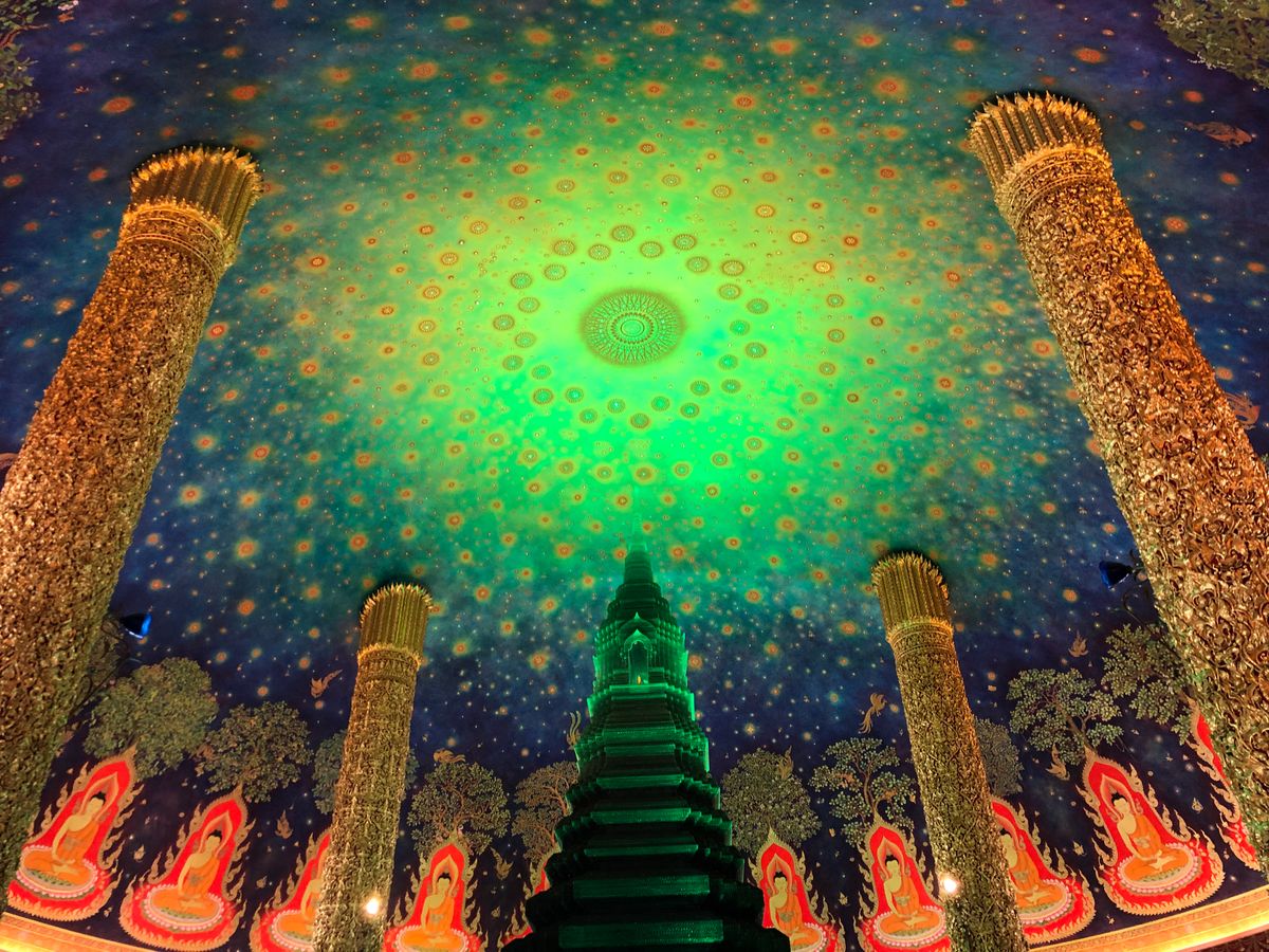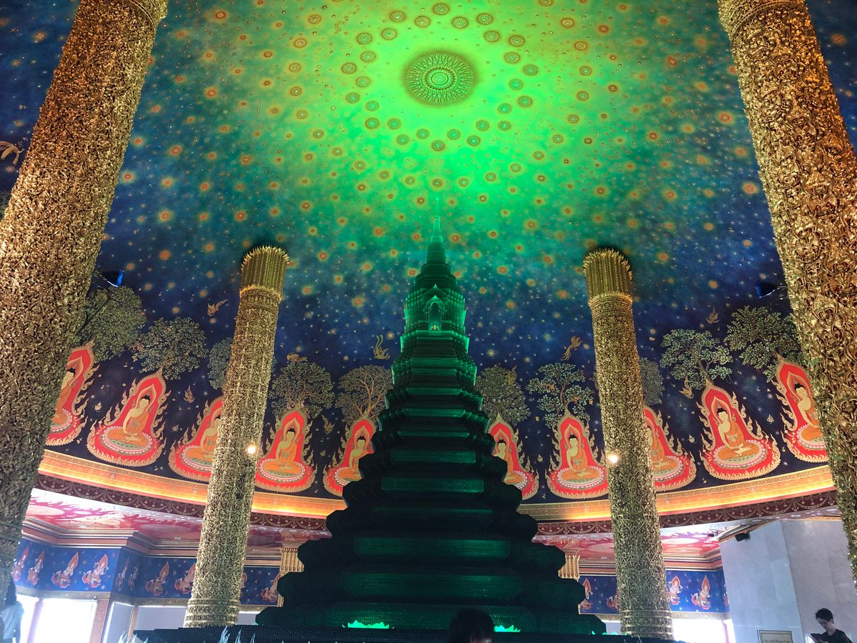 当日は各自でインターコンチネンタルホテルに集合し、午前中はインスタ映え寺院へ、他6名様と一緒にバンで出発、ピンクのガネーシャが鎮座するワット・サマーンラッターナーラームへ向かいました。移動時間約1時間半、滞在時間約20分、その後、次の目的地ワット・パクナムへ向かいました。移動時間約1時間半、滞在時間約30分、インターネットでよく見かけるエメラルド色の天井画は圧巻でした。2寺院とも到着後、ガイドさんから簡単な説明があり、グループ毎の写真を撮っていただき、その後、自由行動で各自、写真撮影、見学をしました。