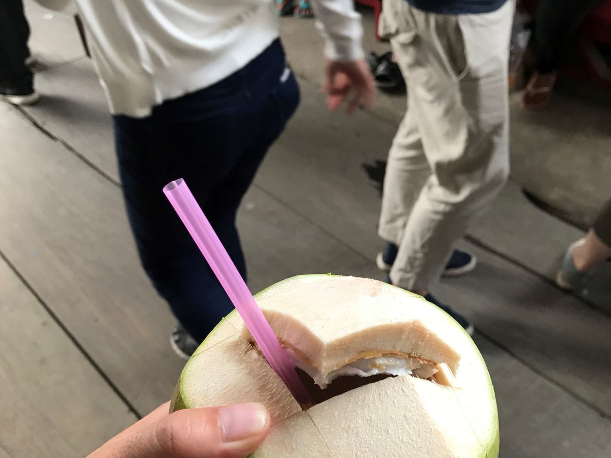 次にココナッツ工場を経由して水上マーケットに行きますが、こちらは舟が一番面白いです。凄いスピードで水上を走っていくのでスリル満点です。が、マーケットの物価は異常に高いです。ガイドさんも「ここで買うのはあまりお勧めできない」と話していました。また、舟の上やマーケットの出口で、可愛い小さい猿やニシキヘビを肩に抱いて「触っていいよ」と言ってくる輩がいますが、絶対に触らないようにしましょう。触ったら最後、法外な代金を要求してきます。舟の上で触ってしまったら、財布の紙幣を全部渡すまで舟を降ろしてくれないというケースもあるそうです(実際、知人は8,000円分くらいの紙幣を全部取られたそうです)。特に、若い女性だけのグループが狙われるようです。