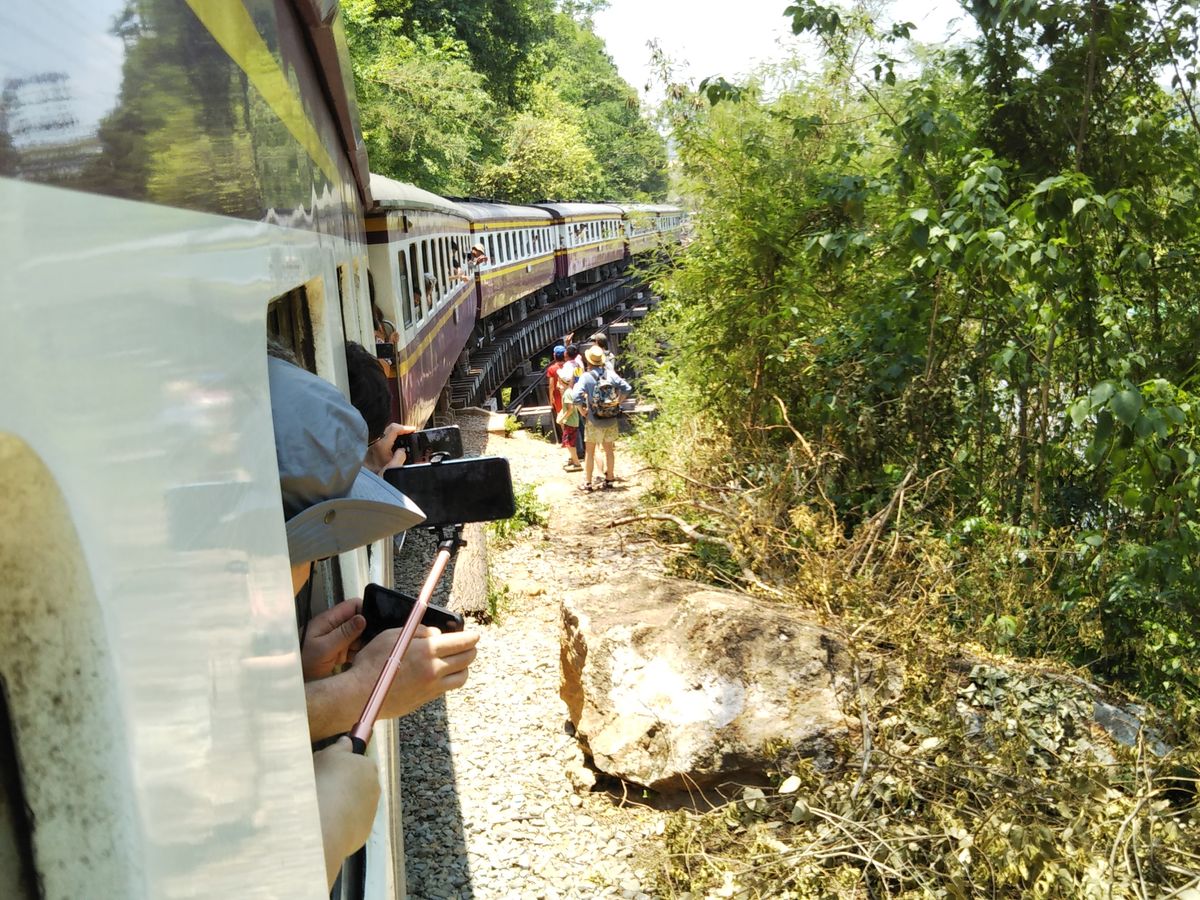 バンコクからバスで行きますが途中ナコンパトム寺院の寄ります。戦争博物館、連合軍共同墓地、日本軍戦没慰霊塔へ行きますが戦争で亡くなった方が若い人が多くびっくりしました。クウェー川鉄橋では線路を歩き橋を渡ることができます。対岸に行き橋を見るのがいいと思います。泰麺鉄道は鉄道は途中は畑の中を走るだけですがタム・クラセー駅に着き桟道橋を歩いて戻れとてもいいところだと思います。