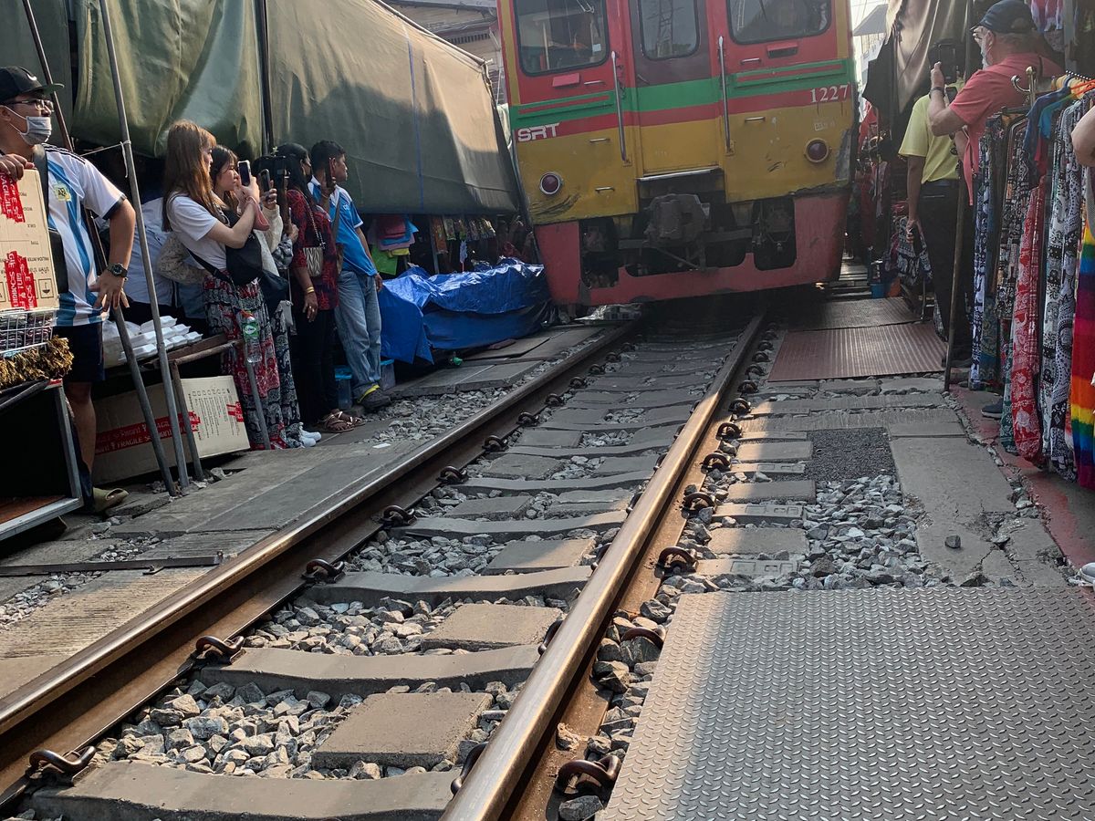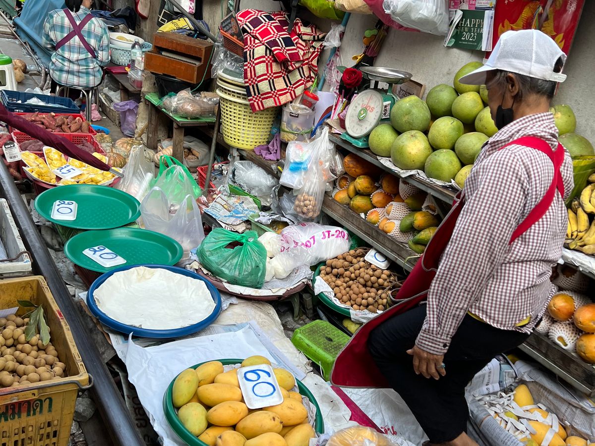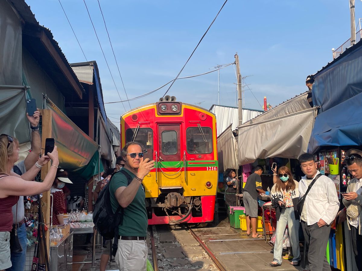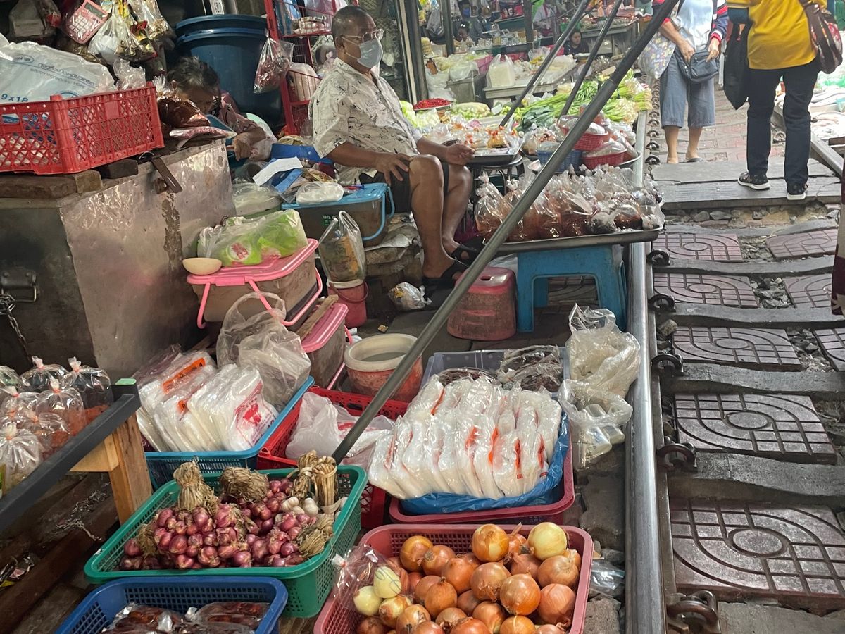メークロン市場では先に線路沿いの市場tれを散策。その後ローカル列車に乗るというツアーでは珍しい体験をした。列車の中から、市場の店のテントが次々と閉じる景色が見れてよかった。