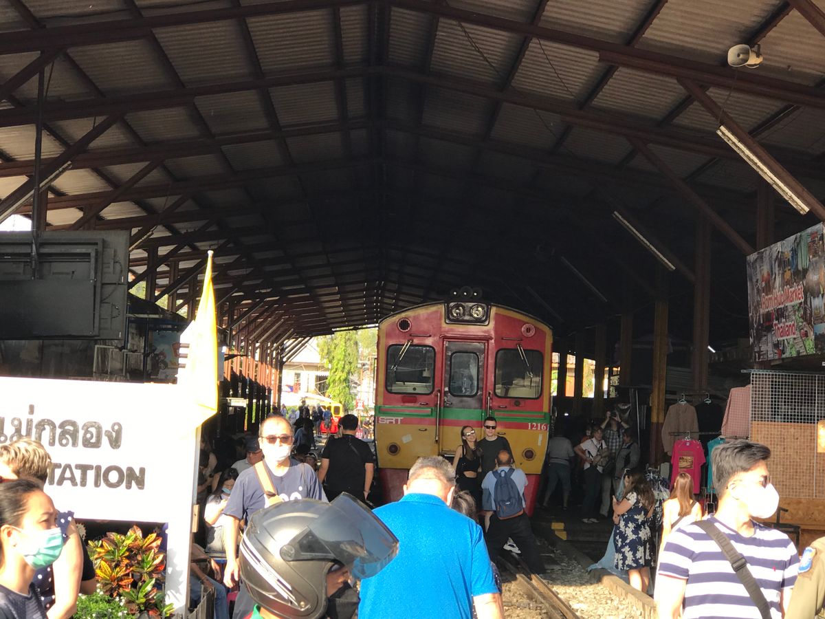 メークロンの列車では一番前より後ろがおすすめと一番後ろの車掌席に案内してくださり、間近で市場の様子をみることができました。