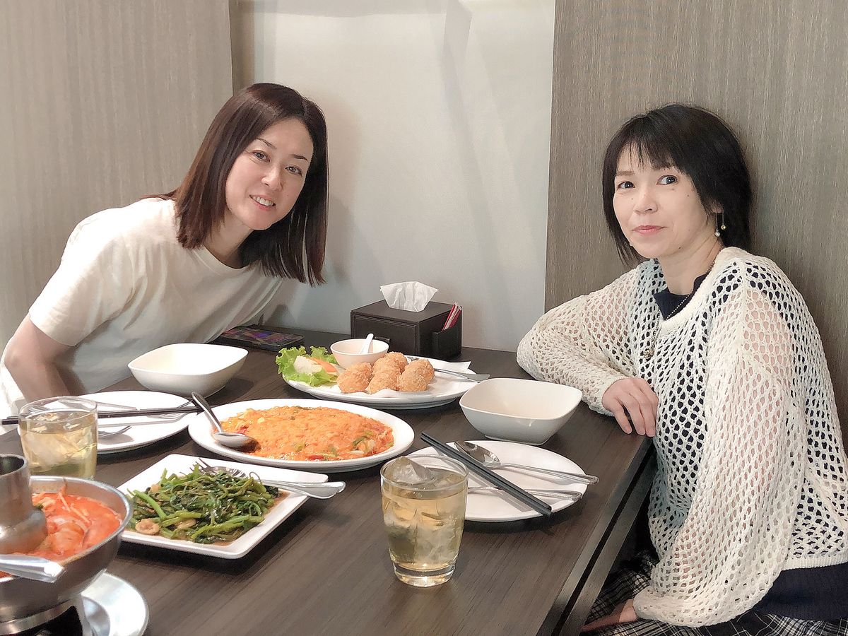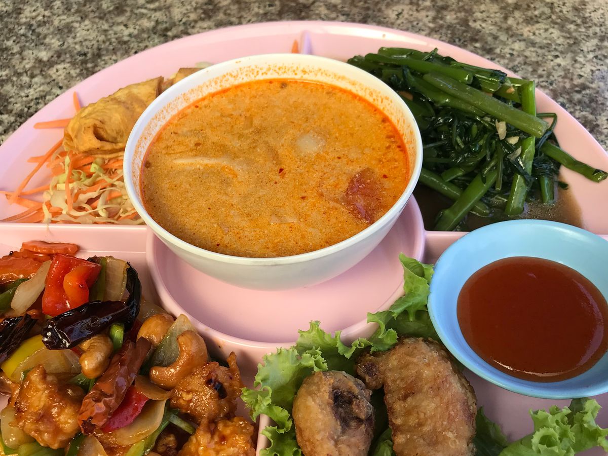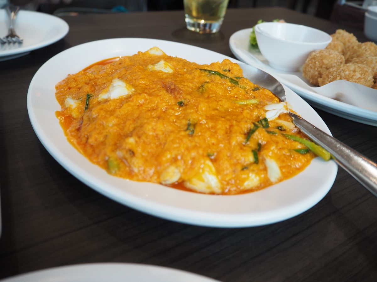 カニの卵炒め、空芯菜の炒め物、揚げたてエビ団子、トムヤンクン、ご飯。