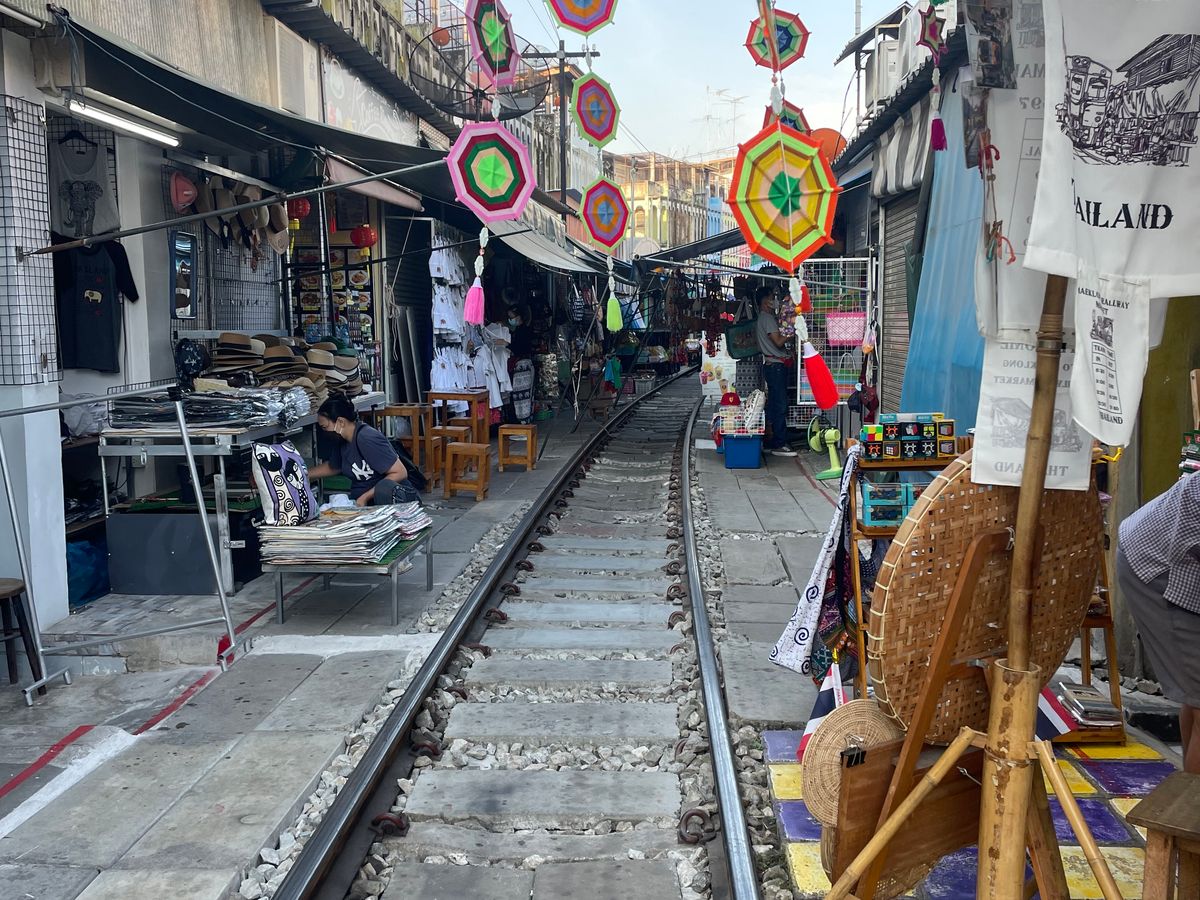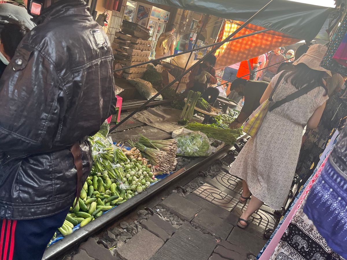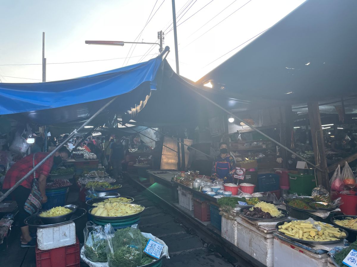 初めてのメークロン市場、線路脇のお店を見るのも楽しかったし、電車がギリギリを走る緊張感も面白かった。