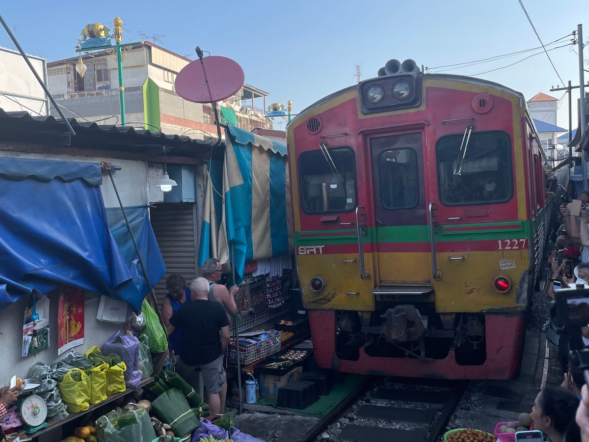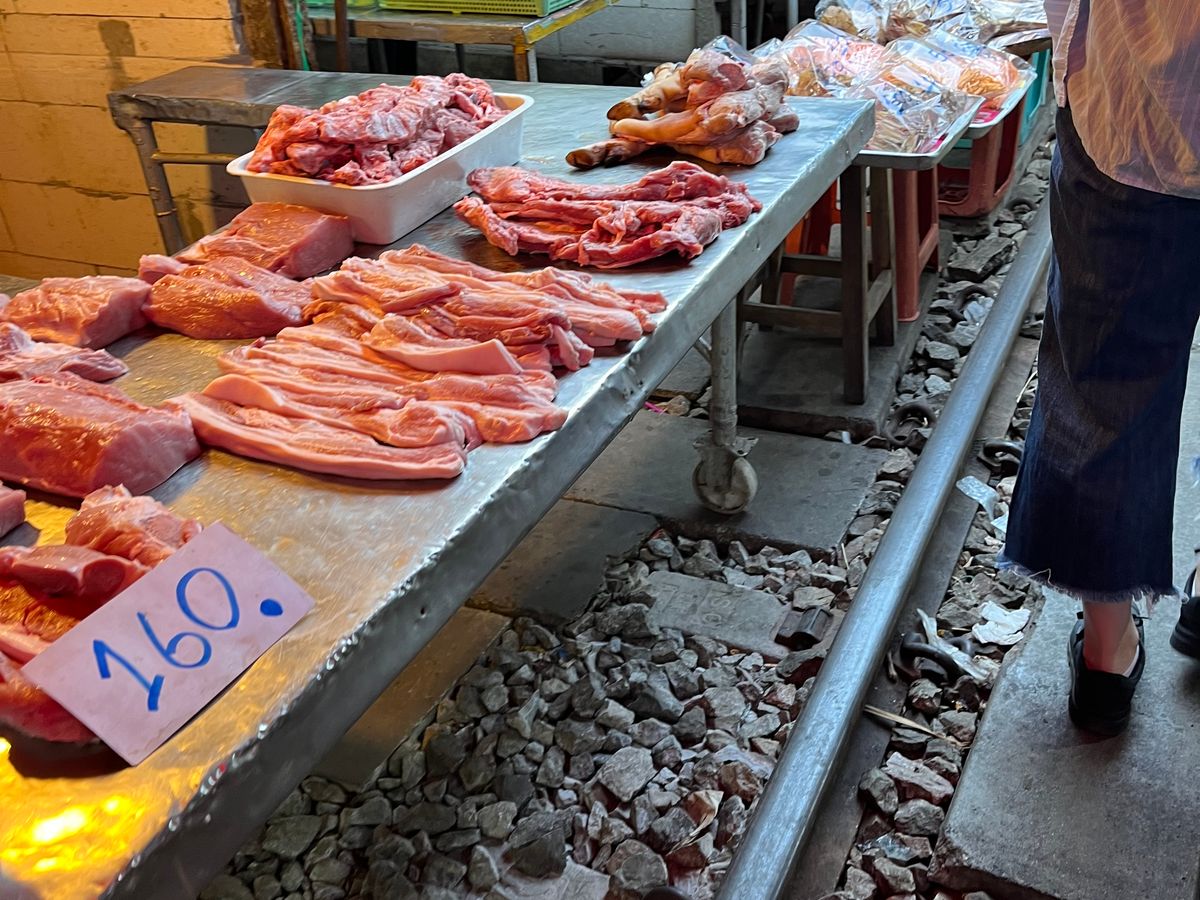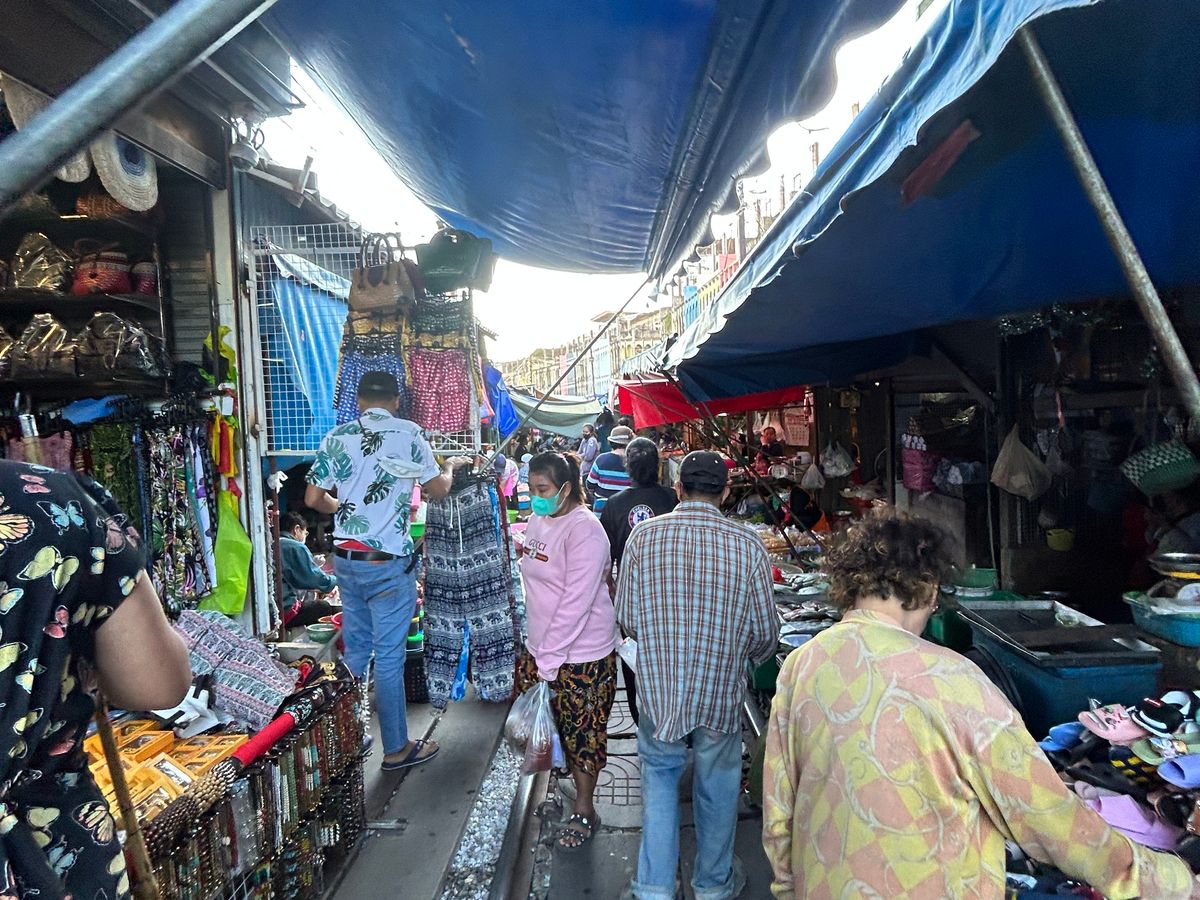 初めてのメークロン市場、線路脇のお店を見るのも楽しかったし、電車がギリギリを走る緊張感も面白かった。