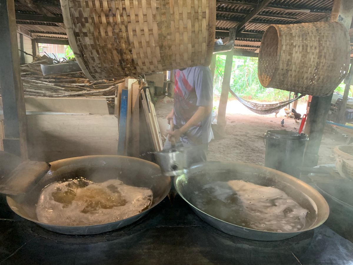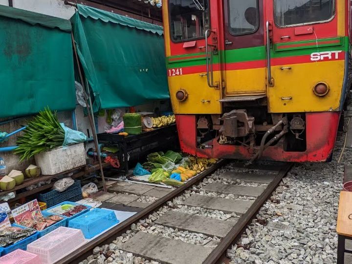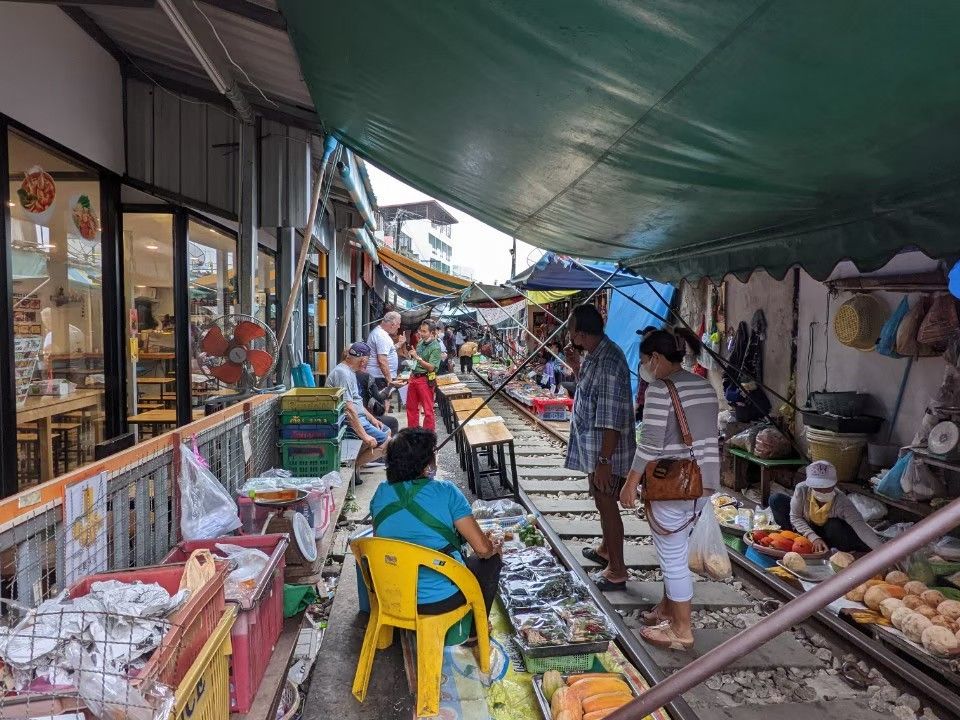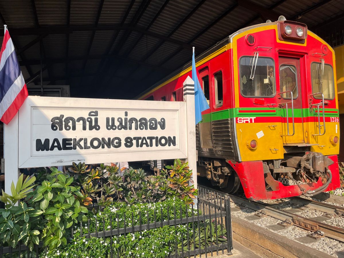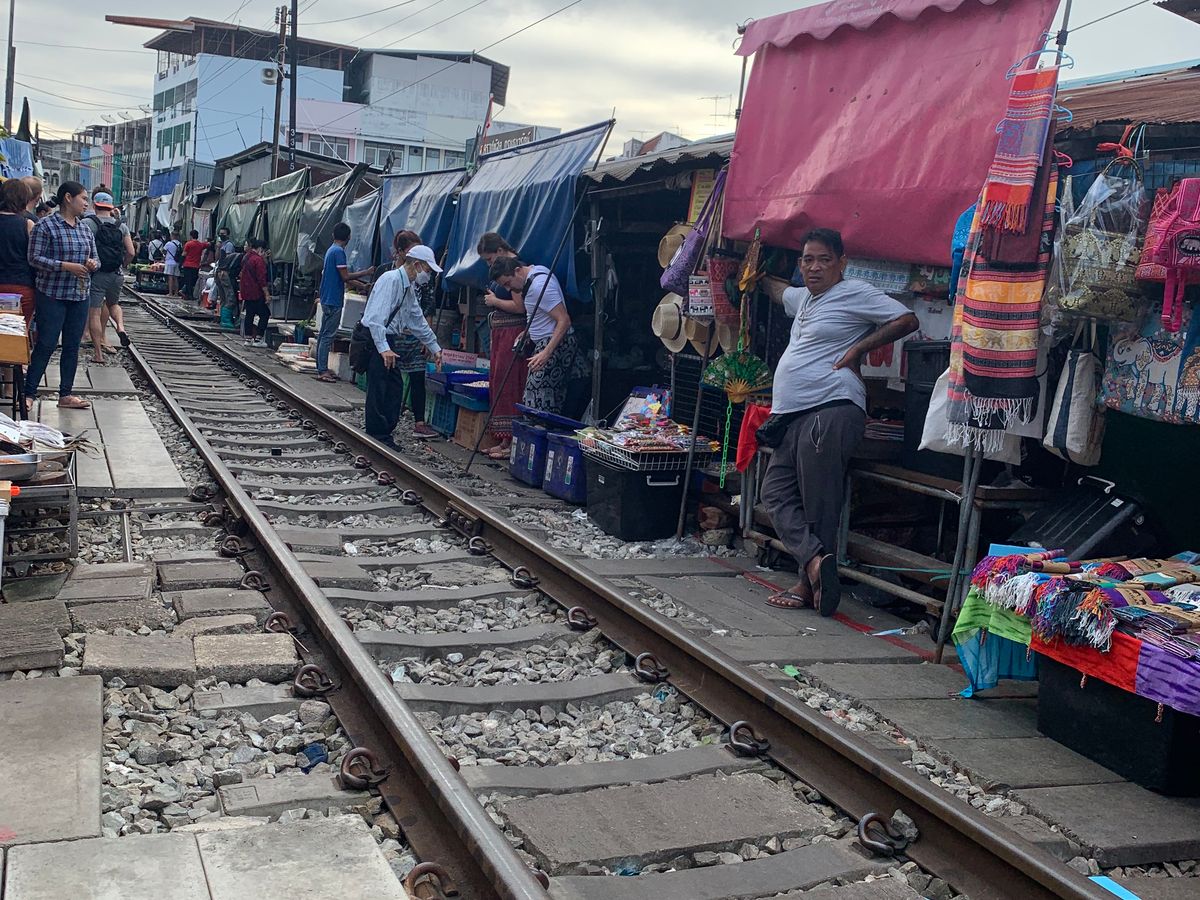 メークロン市場では、電車の時刻1時間ほど前の、まだ畳まれていないお店が多い線路の所で写真を撮ってくださいました!メークロン駅の端の店のカオマンガイ、豚の皮を揚げたもの(カツの衣が皮になっているような食べ物)がおすすめ!とのことだったので、そこで朝ごはんをチャーさん(『お茶の"チャ"で覚えやすいね〜』とフレンドリーなガイドさんです)と一緒にいただきました。(4.50バーツほど)そこで8時ごろになり、その後川の説明(もしチャーさんが"こうりゅう"と教えてくれたら合流ということです笑 なんて言う??と聞かれて"合流or一緒になる”、と伝えたのですが、どうしても ご→こ に聞こえます)線路沿いから離れた市場をうろうろしてベストスポットに戻ってきたのが8:15ほど(見る時間は8:30)だったので、もしそこで朝食を食べなければ時間を持て余すかも。