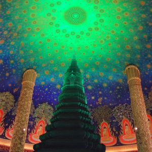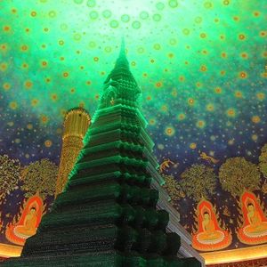 昼から集合。午前中のツアーに参加していたのですが、すでに渋滞が影響して近くのハンバーガーショップで慌てて食事してギリギリに集合。まずは緑の仏塔へ。ここは新しいお寺だそうで、特に歴史等の説明はなく、緑のガラスの仏塔前でSNS映の写真を撮るのみです。次にピンクガネーシャへ。83キロ先で1時間43分かかりました。18:00ごろで日没ギリギリです。ここでもピンクガネーシャをバックに撮影。急ぎバンコクに戻ります。20:40鉄道夜市着。隣接するショッピングセンターパーキングビルから見下ろす写真を撮って夜市を彷徨い屋台で食事。1人50バーツくらいでおいしいタイ料理食べました。最高評価としましたが、移動時間は結構長く遅くなります。自分のニーズとよく合っているか確認することをお勧めします。なお鉄道夜市で解散しますがここからの帰りは激しい渋滞で地下鉄に乗りましたが、券売機が2つしかなく長蛇の列でした。疲れて同行者とケンカにならないようにしましょう。