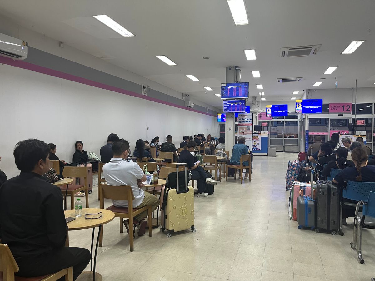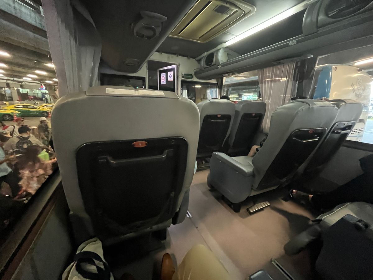 バスはナコンチャイエアー専用のバスターミナルから出発します。出発の1時間半くらい前に到着し、チケット発券機に予約番号を入れて紙のチケットを発券したら、もう出発を待つだけです。ファーストクラス専用の「ラウンジ」という名の待合室がありますが、空港ラウンジのようなサービスは特に何もなく、出発時間まで時間がかなりあったので、バスターミナル内にあるマッサージ店で30分間のマッサージを受けました。料金は30分で125バーツ(約630円)、1時間で250バーツ(約1,250円)と格安です。金額は安いですが、バンコクで何度も受けたマッサージの中でもかなり上位です(かなり痛かったですが...)。