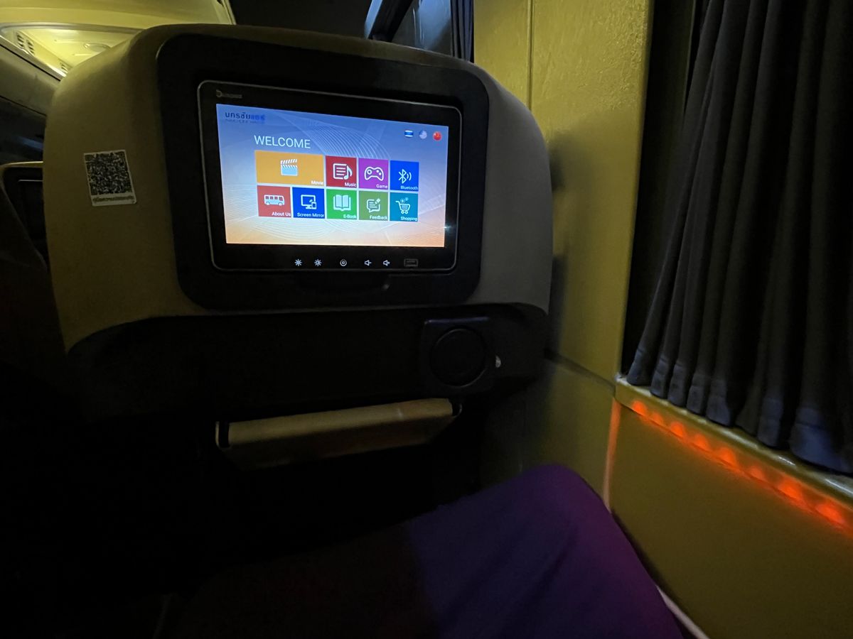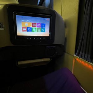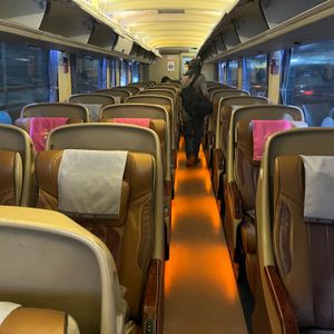 バスに乗車すると、通路を挟んで2-1で大型の皮張りシートが並んでいます。有名航空会社のフルフラットのビジネスクラスほどではありませんが、かなりリクライニングが深いシートです。シェルタイプなので、リクライニングしても後ろの人には何も影響しないのはかなり良いです。シートにはマッサージ機能も付いています。座席の前には飛行機のように個人モニターがあります。日本語対応のものもあるようですが、今回の個人モニターは英語とタイ語のものでした。自分のBluetoothのイヤホンを使えるのは凄く便利ですし、携帯のミラーリングも可能です。映画の種類はあまり多くはないですが、アメリカ映画1本とアニメのカンフーパンダを観ました。