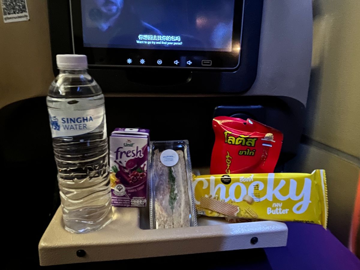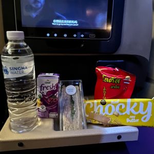 社内にはドライバーとは別に飛行機のCAみたいな人がいて、食べ物やの飲み物をサーブしてくれます。ミネラルウォーター、ジュース(2種類から選択)、サンドイッチ、お菓子2種類(4種類から選択)が配られました。結構なサービスです。