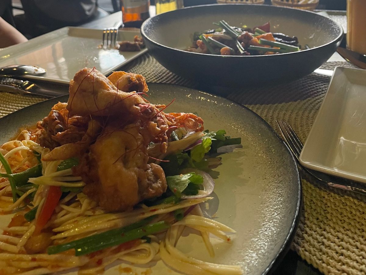 2種類のタイ料理と蟹カレーが食べたかったので、最初の注文時に2種類のタイ料理を頼み、メニューに書かれているメニュー名を指して「これは蟹カレーですか?」と聞いたのですが「ちょっと待ってください」と言われたきりで、その後は私達を避ける様になりました。なので他のウエイトレスさんにお願いして蟹カレーを注文したのですが、他に注文した2種類のタイ料理は届かず。