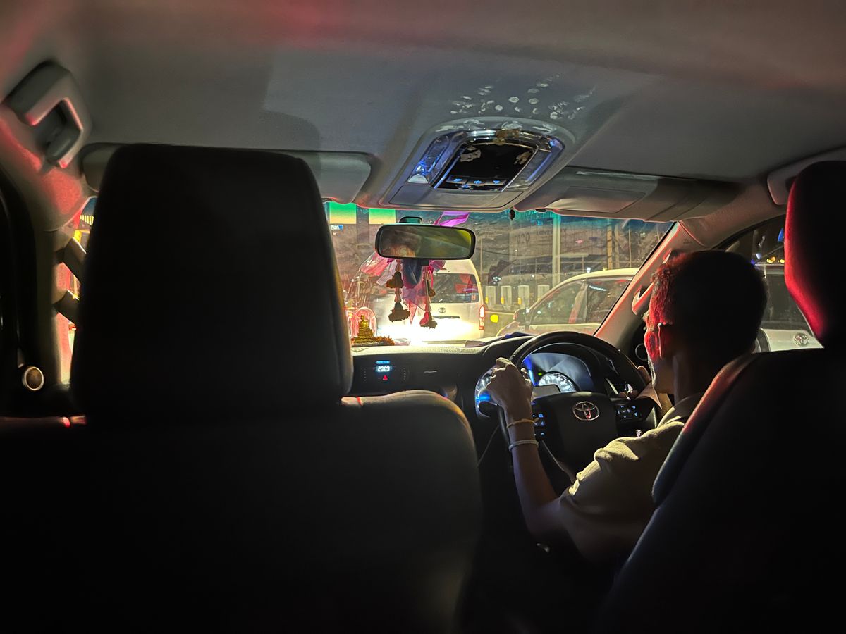 バンコク市内の宿泊ホテルに20:00にピックアップだったので、この時間帯は渋滞が酷いので多少遅れて来るかもと思いつつ、19:59にホテルの入口に行ったところ、ホテルの地下駐車場から車が上がってきたところでした。早めに来て、駐車場で待っててくれたんだと思うと感謝です。