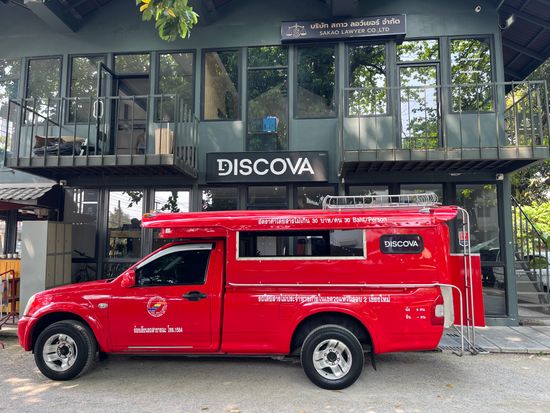 自分では行きにくいチェンマイ郊外の観光地を巡るツアーに参加しました。出発地は旧市街のにある催行会社「DISCOVA」のオフィス。DISCOVA仕様の真っ赤な可愛いソンテウに乗ってきます。外観はローカルっぽいですが、車内はカスタマイズされていて、ローカル気分で快適に移動ができます。