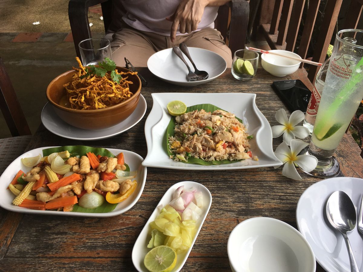 スープ、野菜炒め、甘酢炒め、トンカツ、ご飯、パパイヤとマンゴーのデザート、珈琲か紅茶で美味しかったです。自費でスイカジュースとパイナップルジュースを頼みましたが、160バーツ(80×2)もしました。チェンマイの街中でも 40バーツでしたので 高いなと思いました。