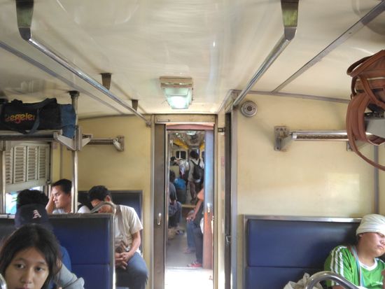 私たちが行ったときは、電車がレトロな旧車両でした。普段はそれほど混んでいないそうですが、休日の最終日だったため帰路につく人も多く、車内は混雑していました。席の近くにドリアンをお土産にしている方がいて、においがかなり強烈でした。
