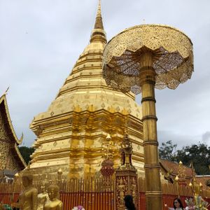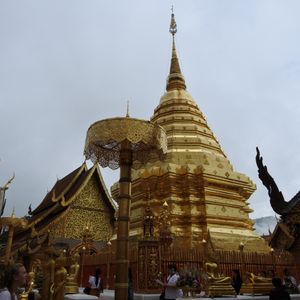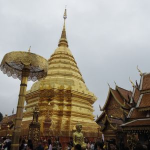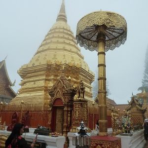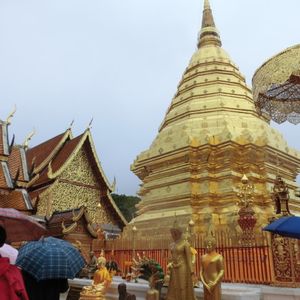 ガイドのセキサンさんとドライバーのトウさんに、ドイステープ寺院に案内してもらった。朝は曇りから小雨に代わり、どうかな思っている内にケーブルカーで頂上につき、裸足で仏舎利塔付近を説明を受けながら廻った。ほぼお参りや写真撮影が終わったころ、雨が激しくなっていた。下山途中の撮影スポットでは、雨もあがり、霧も晴れてチェンマイの街一望とともに記念撮影ができた。ガイドのセキサンさん、ドライバーのトウさんも親切で、とても楽しめました。