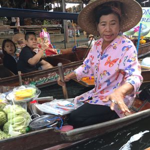 朝早くからホテルに迎えに来てもらえて助かります。「線路市場メークロン」は、聞きしに勝る、興奮できた体験でした。本当に映像で見る以上にすごい!毎日商品を売っている人には何でもないのでしょう。電車も慣れたものです。日本では絶対にありえません。「水上マーケット」も楽しい場所です。最初、ボートはかなりのスピードで走りますが、モノを売る船が多くなると、ものすごい押し合い圧し合い状態です。自分は、少々おなかが心配でしたので何も食べませんでしたが、うまそうです。最後に昼食でおいしいラーメンとアイスをいただき、満足できたツアーでした。