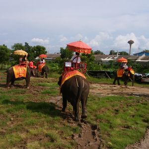 アユタヤに到着後まず最初にゾウ乗り体験があり、この時は大雨が降っていました。簡易レインコートと折り畳み傘では役に立たず、全身新ずぶ濡れになりました。大雨の中のゾウ乗りはお勧めしません。