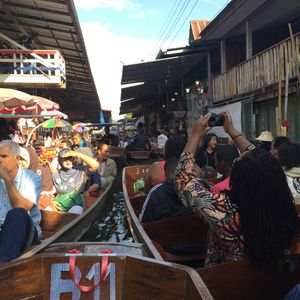 続いて水上マーケットに移動。こちらも観光客で大混雑。まずはエンジン付きボートで移動し、 200バーツの追加料金を払って手こぎボートに乗ることに。1時間待ちでようやく乗り込み出発。物売りの船が密集している間を手漕ぎボートでゆっくり、というはずが、観光ボートが密集し、怒号が飛び交う水路をゴリゴリ進む。ちょっとイメージと違います(星マイナス1)が、それなりに楽しい。