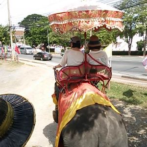 まず、車で1時間かけて水上マーケットに、東南アジアらしい風情を満喫。ここでココナッツのパンケーキを購入、とてもおいしかったが、おつりにUAEの硬貨を渡された。その後、2時間かけてアユタヤ近辺のホテルでバイキング形式の昼食、いろいろな料理(パスタ、中華、太巻き寿司、タイの麺料理、南国フルーツ、ケーキなど)があったのでよかった。アユタヤの寺院には30分程度ずつ観光時間があり、途中、象のり体験500B・記念撮影40Bができた。出発も到着も主要ホテルに送迎があるので大変楽だった。ミネラルウォーターとおしぼりのサービスがありとても助かった。